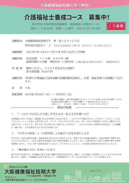 ハローワークの職業訓練「介護福祉士養成コース」学生2次募集を開始しました。(2023年度大阪府委託訓練事業 長期高度人材育成コース)